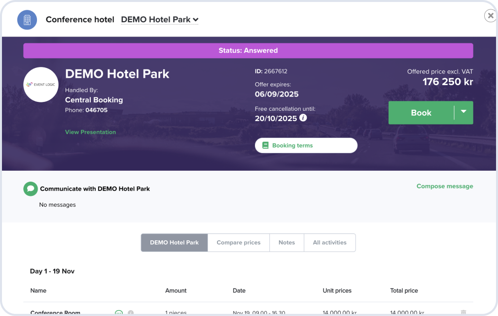 När du som mötesbokare fått in offerter från leverantörer kan du enkelt med en knapp boka det bästa alternativet.